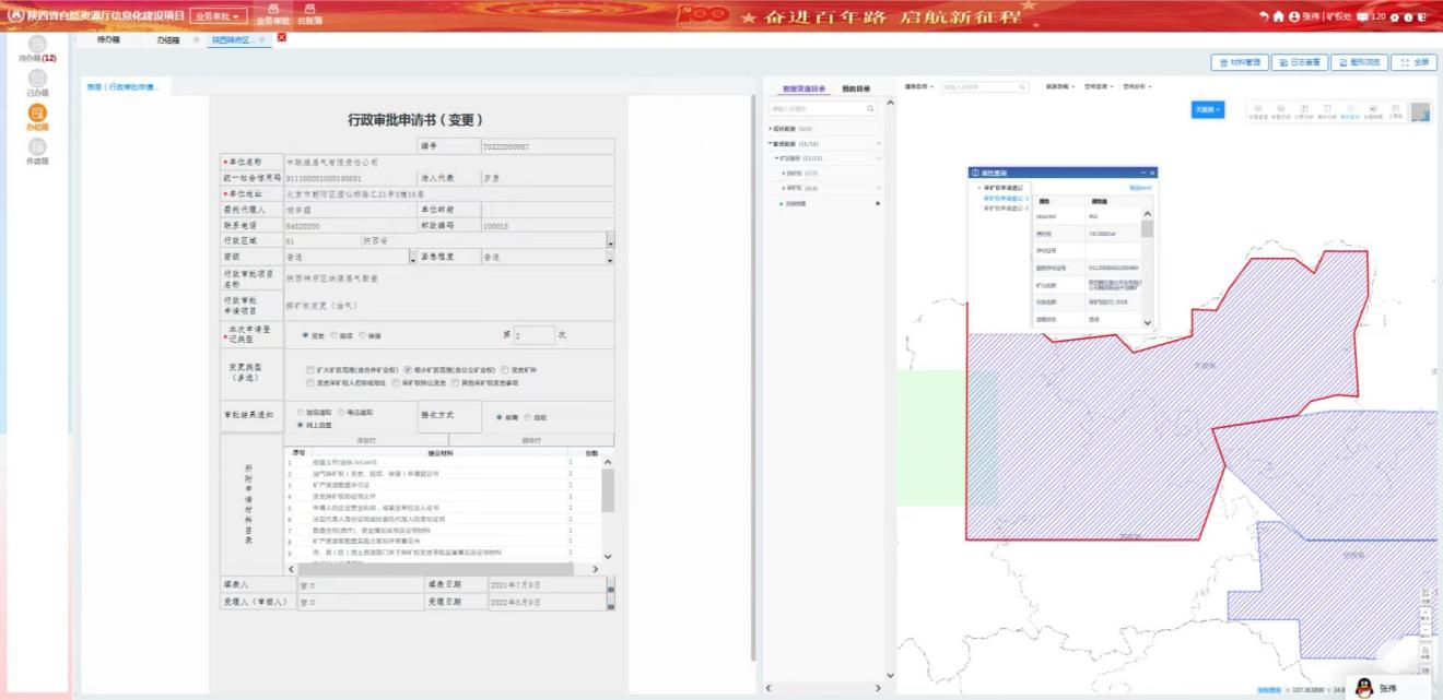 按照陕西省信息化顶层设计,在基础信息平台自然资源调查监测、监管决策、政务服务和防灾减灾四大应用体系的基础上,将各类审批管理系统纳入平台,实现平台统一认证,统一登录,统一门户,强化业务中台作用,促进政务协同。基于平台提供的“一张图”应用共享服务,植入政务审批系统的带图审批的相关工作场景,实现平台与业务系统的衔接,同时按照各类业务全流程审批需求,针对各处室定制化开发重叠分析、地类统计、项目查询、shp导出、汇总统计等功能,有效支撑厅内审批办件共计700余个,极大的提升了政务审批效率,实现信息共享、业务协同、场景联动。