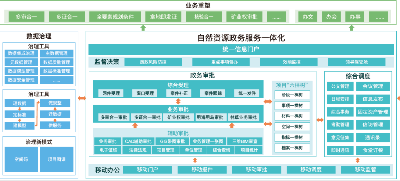 面向自然资源全局人员,聚焦提升政务审批效率和服务能力的目标,以业务整合优化为基础,覆盖土地、矿产、海洋、测绘、林业等业务域,统筹办文、办会、办事等综合事务,打破条块分割,统一审批标准,统筹服务资源,建立集信息统一汇集、全业务在线协同、指标自动检测、空间图形合规审查、关联信息互通共享、综合事务统筹调度、监督监管精准有效的自然资源政务服务一体化智能应用,推进对内对外业务协同,促进政务服务提质增效。