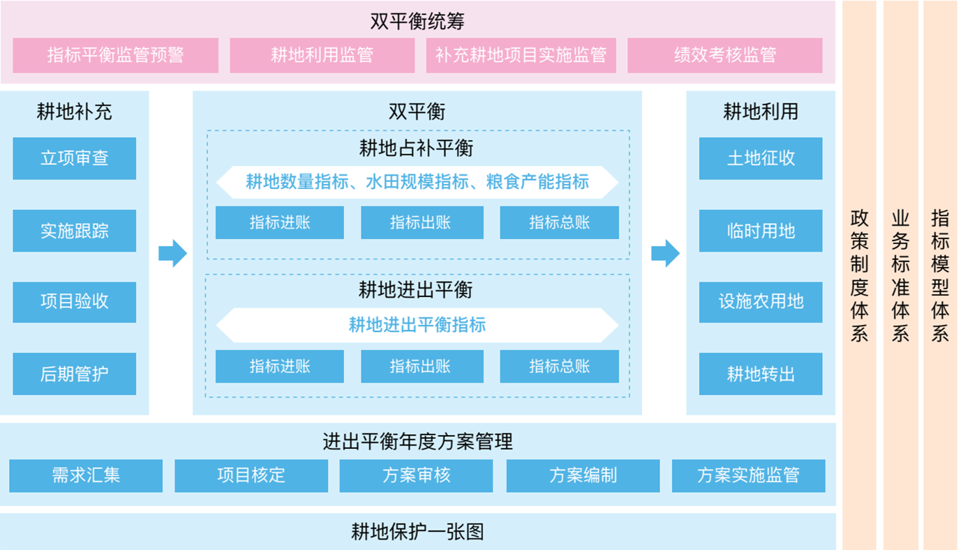 为进一步遏制耕地“非农化”、“非粮化”现象,《自然资源部 农业农村部 国家林业和草原局关于严格耕地用途管制有关问题的通知》(自然资发[2021]166号)明确提出建立落实耕地进出平衡制度、严格管控一般耕地转为其他农用地、并改进和规范建设占用耕地占补平衡。通过双平衡制度的建设,继续落实深化耕地用途管制,确保可长期稳定利用的耕地保质保量补充到位,并不断优化耕地布局。通过信息化建设,加强双平衡管理的整体谋划能力、项目管控能力与指标统筹能力,更好守护耕地红线。